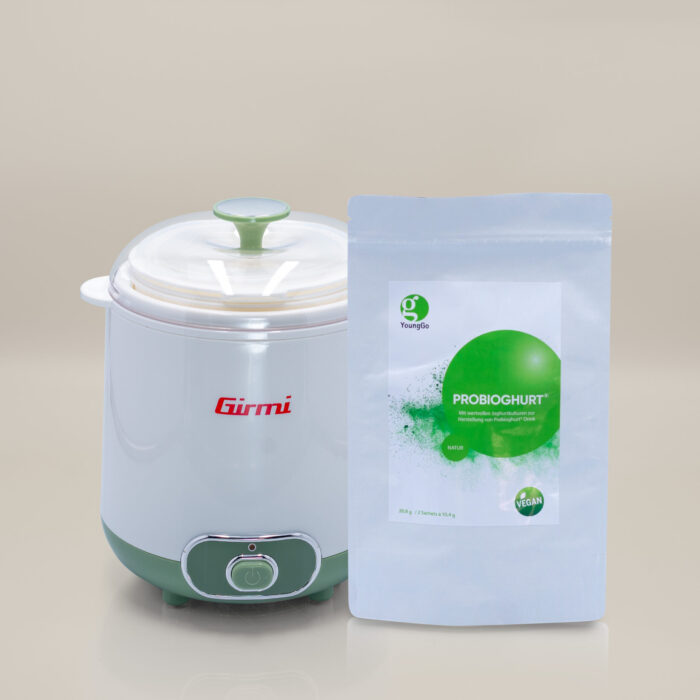 In deinem Starterkit ist ein Girmi Bereiter mit unterschiedlichen Einsätzen, sowie 2 Sachets YoungGo® Probioghurt® Drink enthalten.
